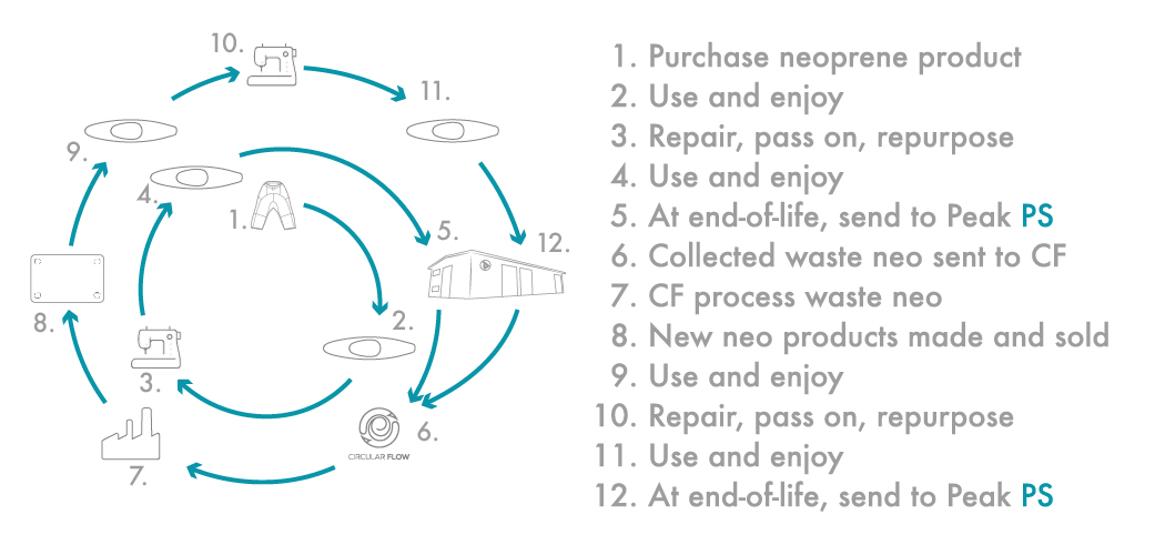 We are very proud to bring new products and an industry leading end-of-life neoprene processing service to our Circular Ready initiative. For the past 2 years we been collecting the neoprene waste from our own custom production here in the UK, ready to send to Circular Flow to be processed into recycled neoprene. We would welcome anyone with Peak branded neoprene equipment (excluding shoes and boots) that has come to the end of its life, to return it to us to join the Circular Ready story. We will coordinate all neoprene waste from our UK premise back to Circular Flow for processing. For outdoors centres, activity providers or larger scale organisations please contact us to discuss workable options.